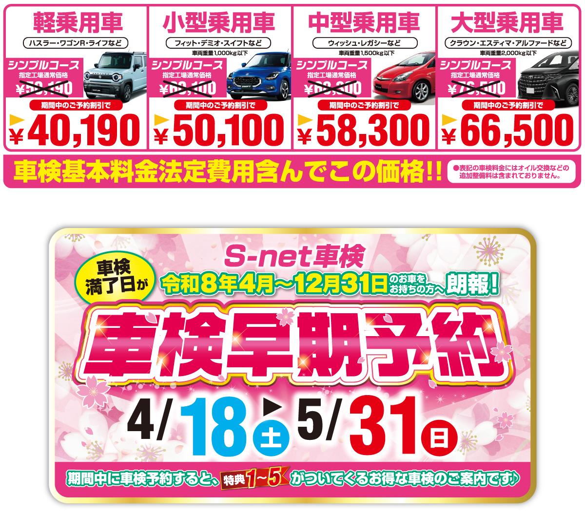 (価格は税込)※認証工場価格では、検査手数料が車両サイズにより650円~750円プラスされます。